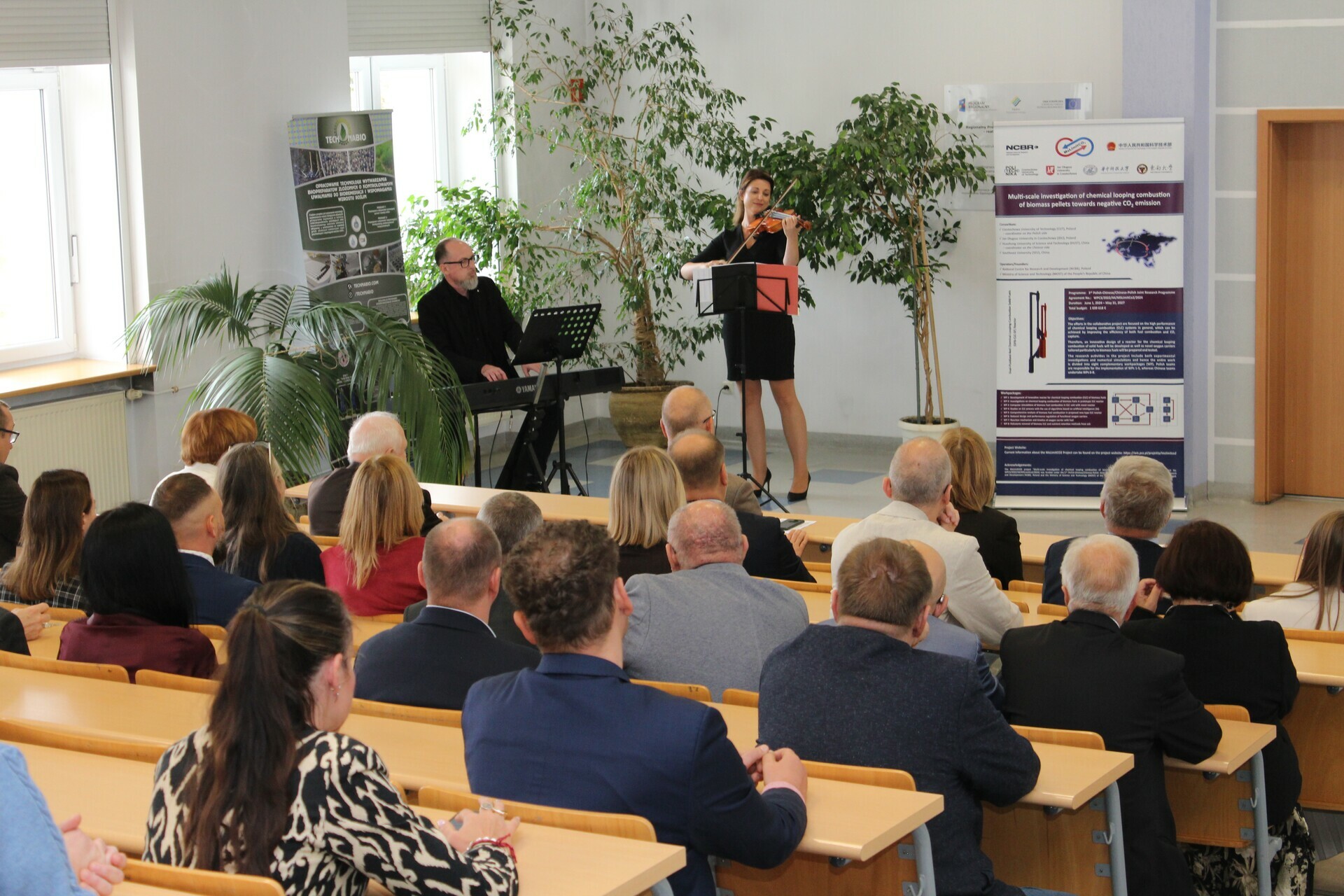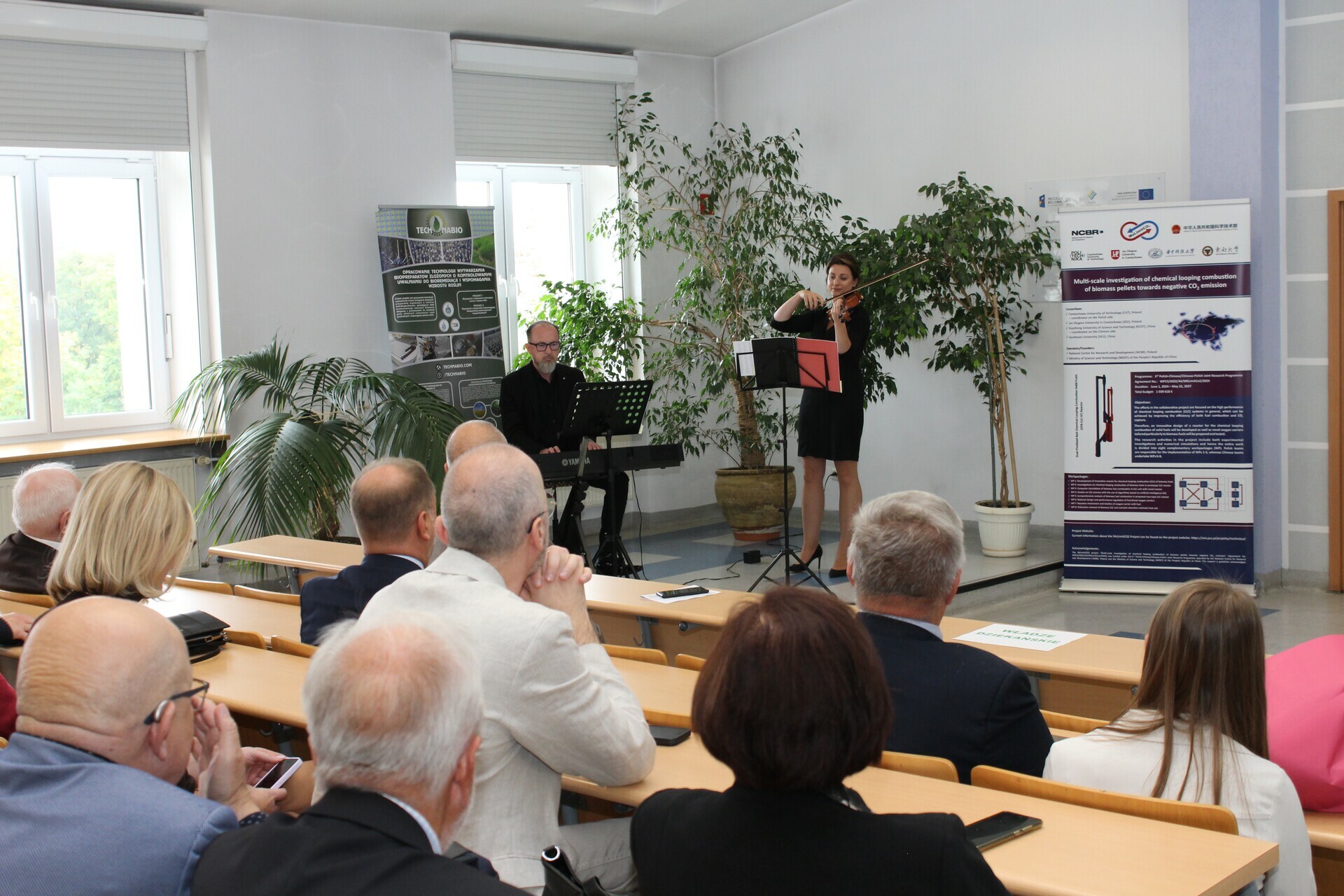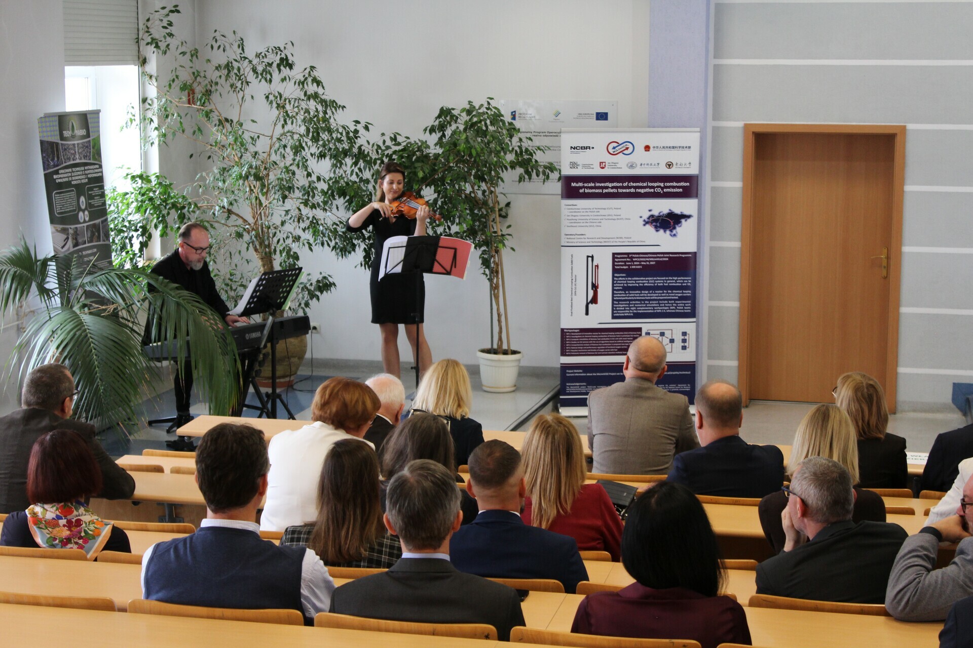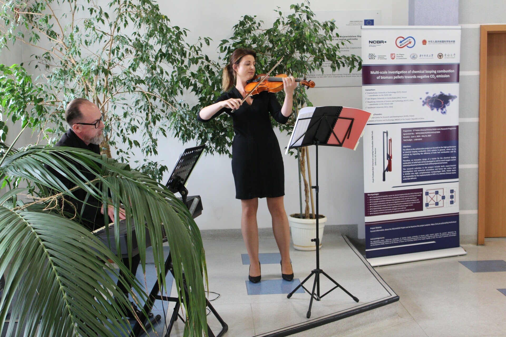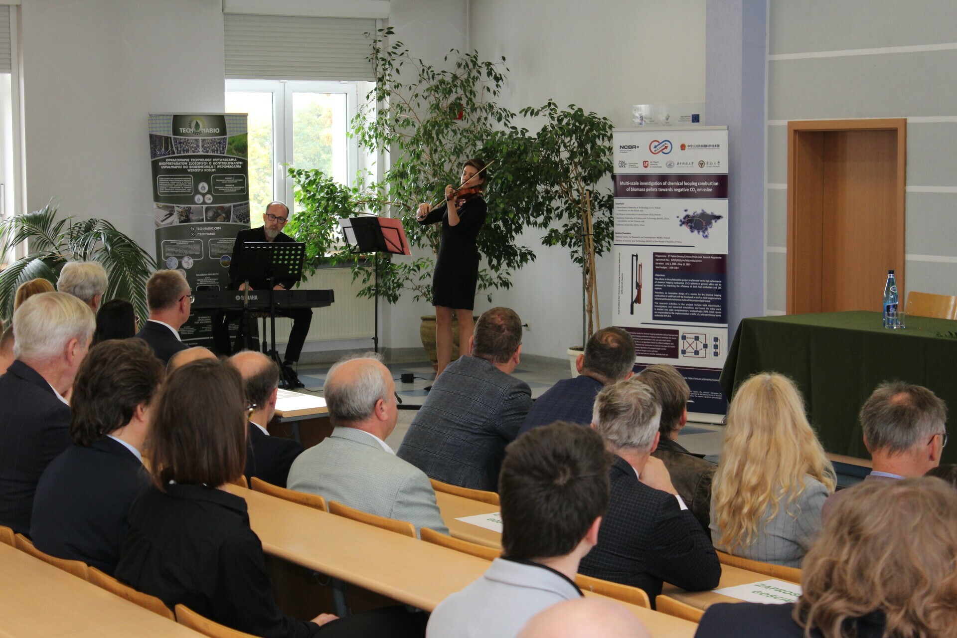 Uroczystość zwieńczył muzyczny akcent – subtelny, pełen emocji występ duetu piano–skrzypce, który wprowadził publiczność w nastrój refleksji i piękna, dopełniając artystycznym tonem całość wydarzenia.